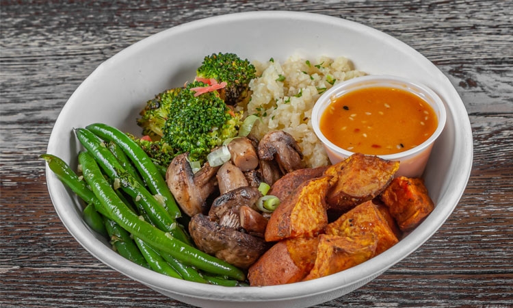 Coconut Rice, sesame ginger broccoli, roasted mushrooms, sesame garlic tofu, and coconut sweet potato sauce *For modifications, please select a Mahana Bowl instead and choose your ingredients.