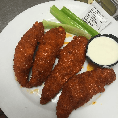 Hand-breaded chicken fingers fried crispy. Tossed in any of our famous buffalo sauces. Served with bleu cheese, celery, fries and home-made coleslaw