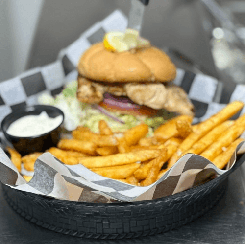 Grilled mahi-mahi served on a grilled bun with lettuce, tomato, and onion. Fries and tarter