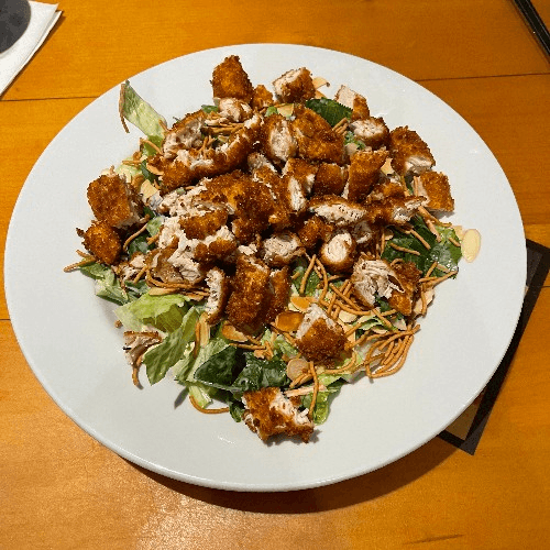 Fried chicken tenders, scallions, sliced almonds, and crispy noodles over oriental salad greens. Served with creamy sesame dressing