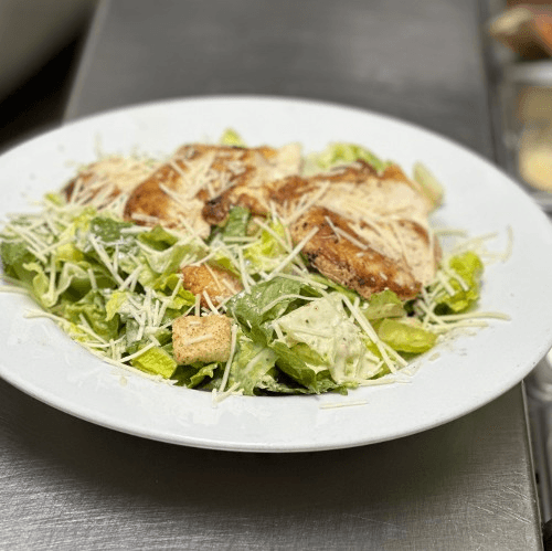 Grilled chicken on a bed of fresh romaine lettuce tossed in our caesar dressing and topped with asiago cheese and croutons
