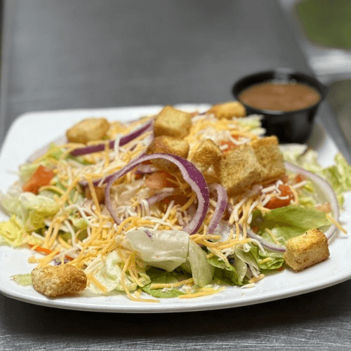 Mixed greens with walnuts, red onion, gorgonzola cheese, diced tomato, bacon bits, and balsamic vinaigrette. *Pictured with Blackened Shrimp